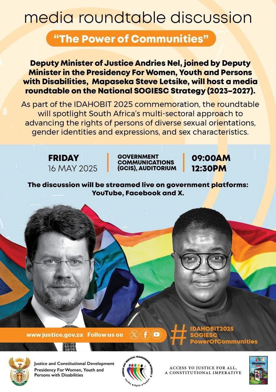 In a bold move to advance equality and strengthen human rights protections, Deputy Minister of Justice and Constitutional Development, Andries Nel, and Deputy Minister in the Presidency for Women, Youth and Persons with Disabilities, Steve Letsike, will co-chair a pivotal media roundtable on South Africa’s National SOGIESC Strategy (2023–2027). The event is scheduled for Friday, 16 May 2025, at the Government Communication and Information System (GCIS) headquarters in Pretoria.